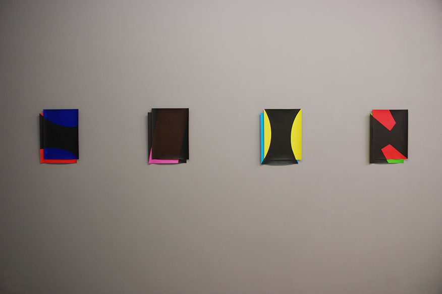The abstract nature requires us to focus on the process, materiality and technique. We give generous attention to every little detail. Before long, the seemingly distant, strict, cold geometries, reveal many traces of the craft and manual labour. Curvaceous paper, accommodates slight concentrations of pigments, sharp contours give way to subtle imperfections and softly blurred edges. e situations gain confidence, and adopt a more playful language.