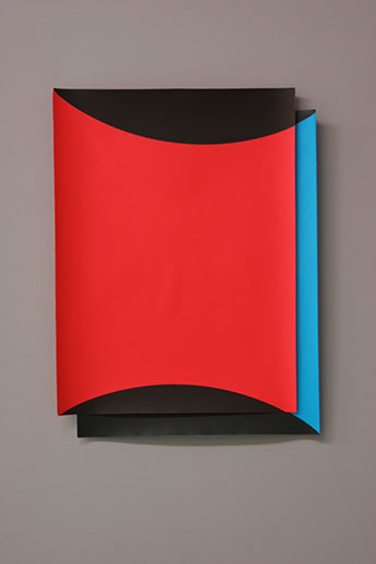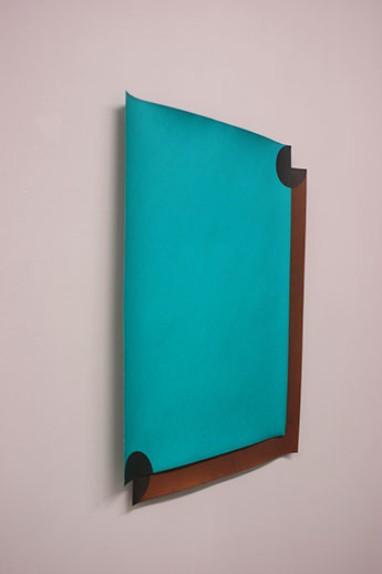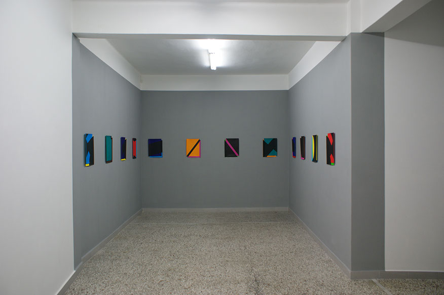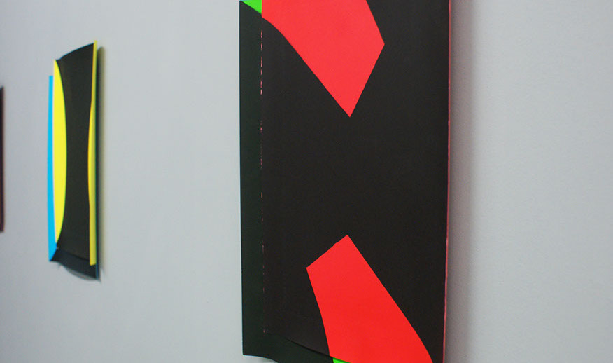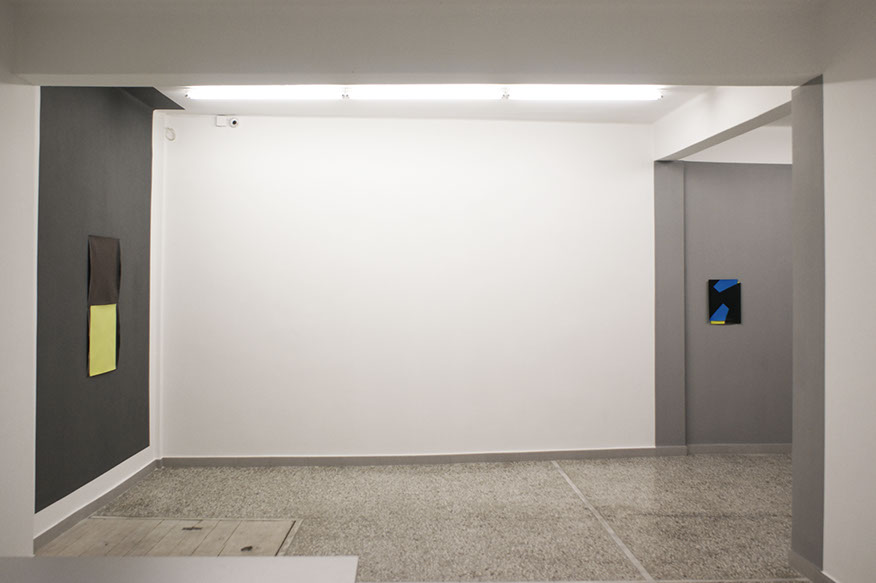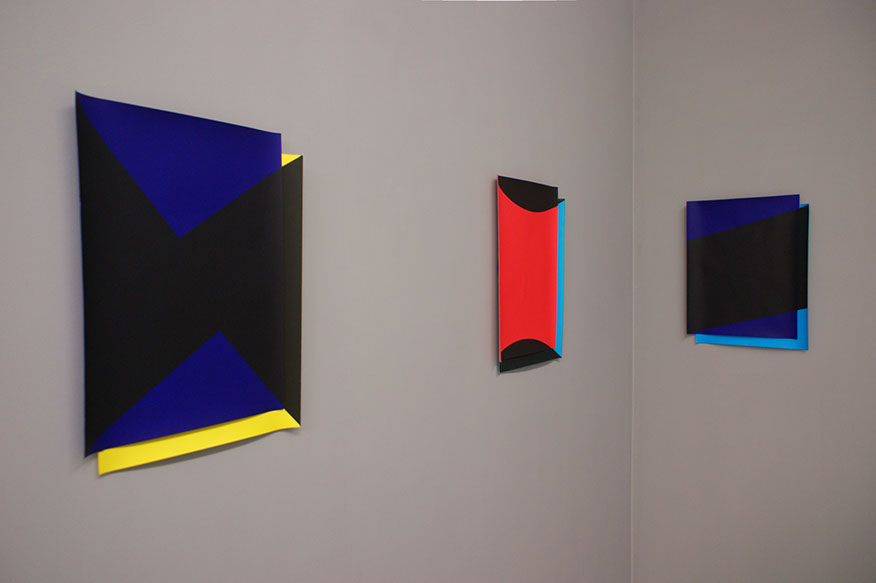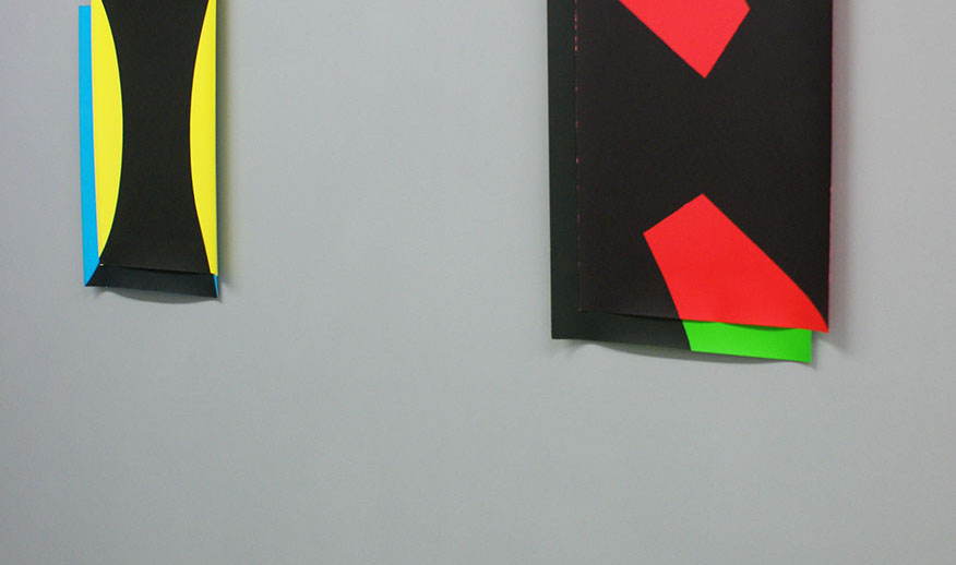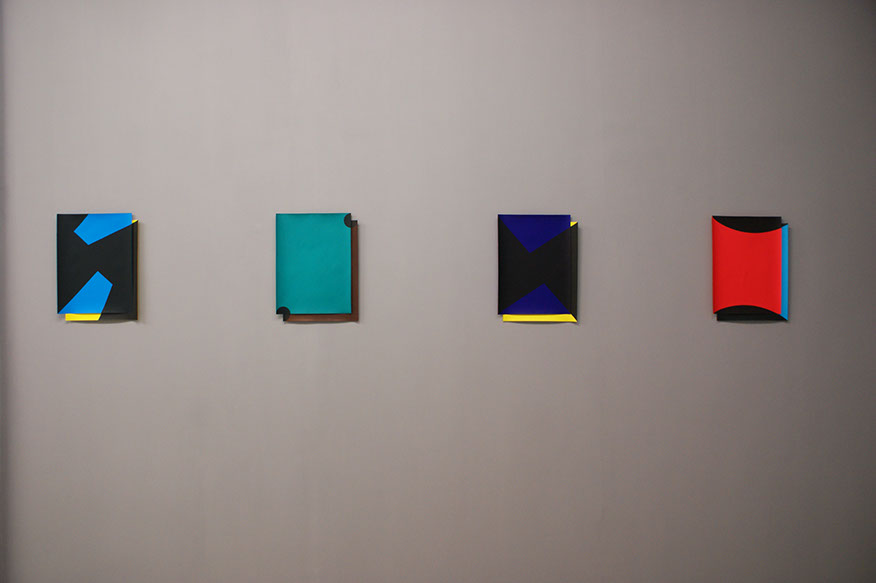 The abstract nature requires us to focus on the process, materiality and technique. We give generous attention to every little detail. Before long, the seemingly distant, strict, cold geometries, reveal many traces of the craft and manual labour. Curvaceous paper, accommodates slight concentrations of pigments, sharp contours give way to subtle imperfections and softly blurred edges. e situations gain confidence, and adopt a more playful language.